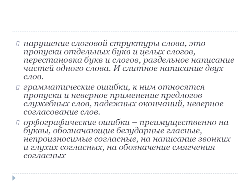 Слайд 22нарушение слоговой структуры слова, это пропуски отдельных букв и целых
