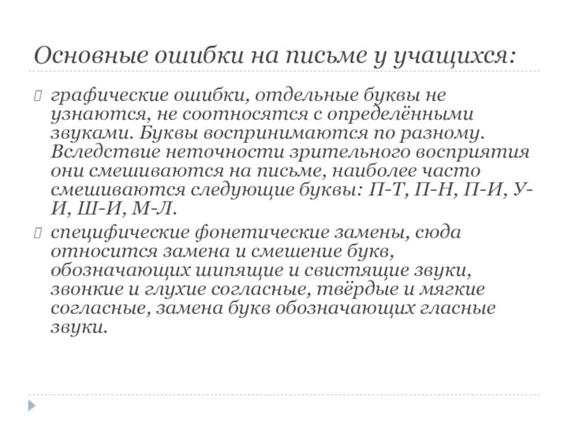 Вследствие неточности зрительного восприятия они смешиваются на письме, наиболее часто смешиваются следующие буквы: П-Т, П-Н, П-И, У-И, Ш-И, М-Л.