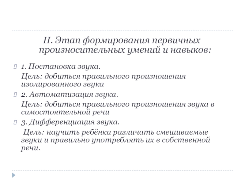 Слайд 11II. Этап формирования первичных произносительных умений и навыков: