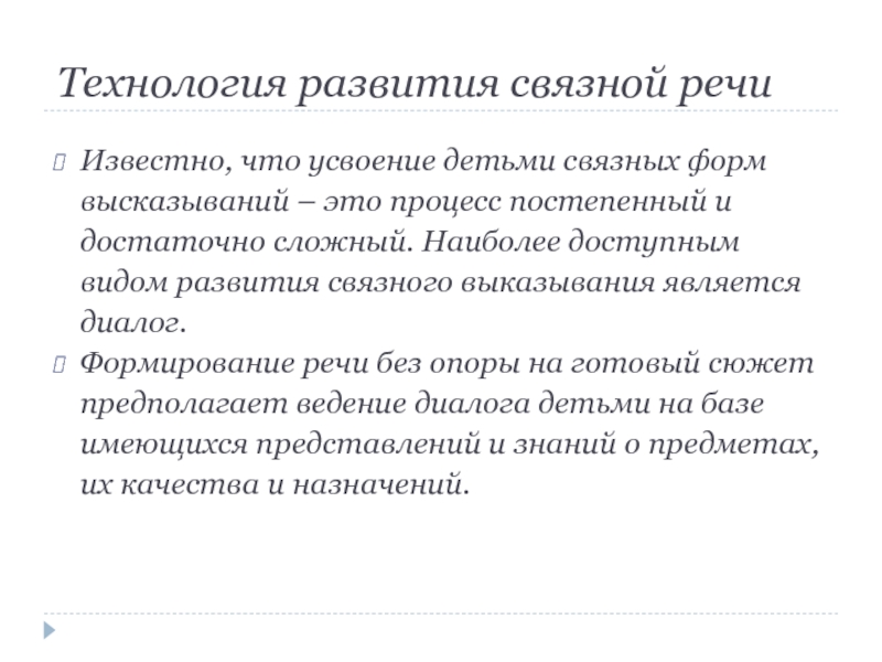 Формирование речи без опоры на готовый сюжет предполагает ведение диалога детьми на базе имеющихся представлений и знаний о предметах, их качества и назначений.