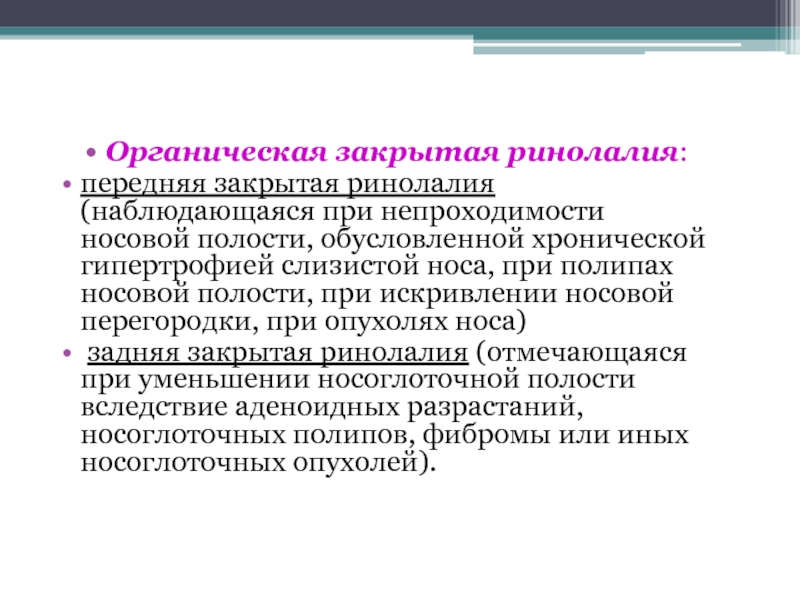 задняя закрытая ринолалия (отмечающаяся при уменьшении носоглоточной полости вследствие аденоидных разрастаний, носоглоточных полипов, фибромы или иных носоглоточных опухолей).