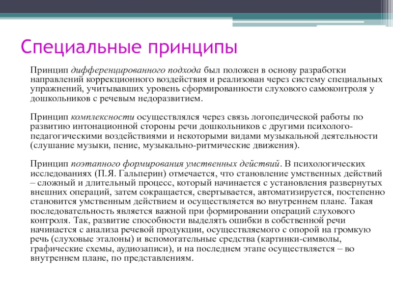 Принцип поэтапного формирования умственных действий. В психологических исследованиях (П.Я. Гальперин) отмечается, что становление умственных действий – сложный и длительный процесс, который начинается с установления развернутых внешних операций, затем сокращается, свертывается, автоматизируется, постепенно становится умственным действием и осуществляется во внутреннем плане. Такая последовательность является важной при формировании операций слухового контроля. Так, развитие способности выделять ошибки в собственной речи начинается с анализа речевой продукции, осуществляемого с опорой на громкую речь (слуховые эталоны) и вспомогательные средства (картинки-символы, графические схемы, аудиозаписи), и на последнем этапе осуществляется – во внутреннем плане, по представлениям.