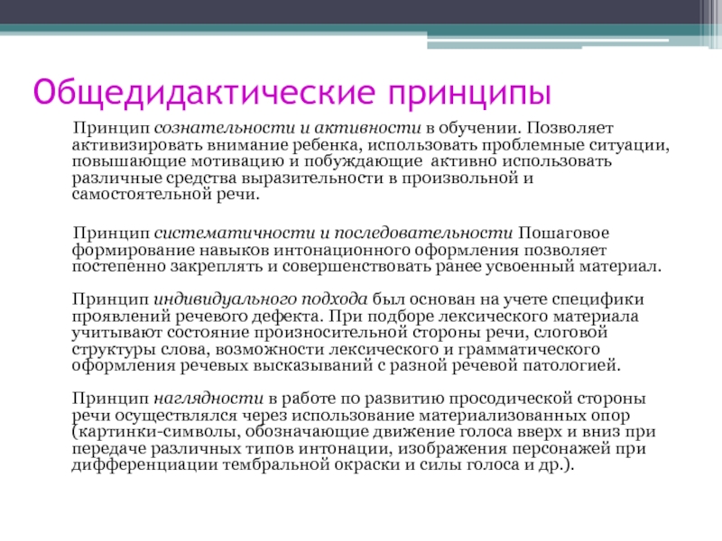 Принцип наглядности в работе по развитию просодической стороны речи осуществлялся через использование материализованных опор (картинки-символы, обозначающие движение голоса вверх и вниз при передаче различных типов интонации, изображения персонажей при дифференциации тембральной окраски и силы голоса и др.).
