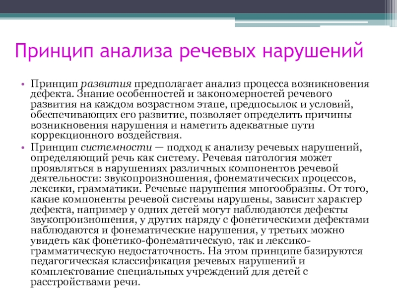 Принцип системности — подход к анализу речевых нарушений, определяющий речь как систему. Речевая патология может проявляться в нарушениях различных компонентов речевой деятельности: звукопроизношения, фонематических процессов, лексики, грамматики. Речевые нарушения многообразны. От того, какие компоненты речевой системы нарушены, зависит характер дефекта, например у одних детей могут наблюдаются дефекты звукопроизношения, у других наряду с фонетическими дефектами наблюдаются и фонематические нарушения, у третьих можно увидеть как фонетико-фонематическую, так и лексико-грамматическую недостаточность. На этом принципе базируются педагогическая классификация речевых нарушений и комплектование специальных учреждений для детей с расстройствами речи.