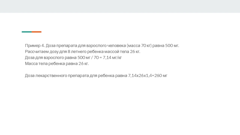 Слайд 31Пример 4. Доза препарата для взрослого человека (масса 70 кг)