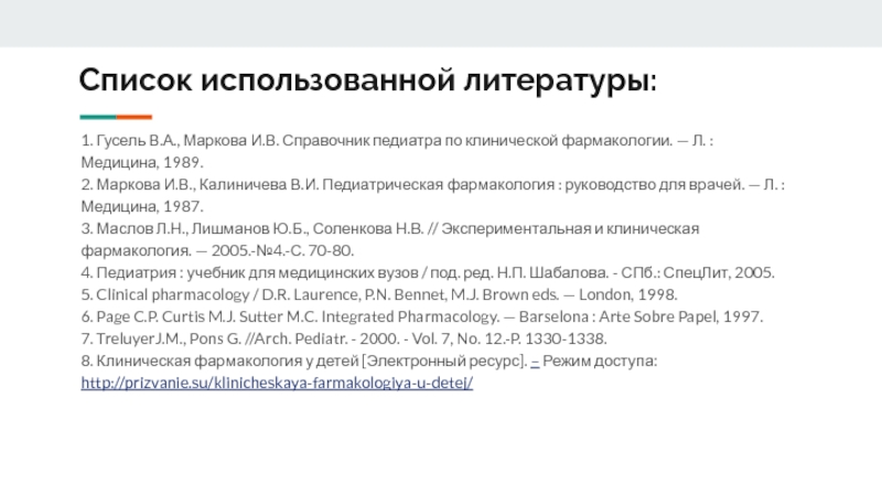 8. Клиническая фармакология у детей [Электронный ресурс]. – Режим доступа: http://prizvanie.su/klinicheskaya-farmakologiya-u-detej/