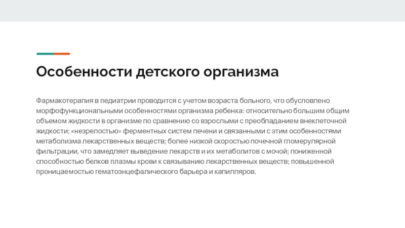 жидкости в организме по сравнению со взрослыми с преобладанием внеклеточной жидкости; «незрелостью» ферментных систем печени и связанными с этим особенностями метаболизма лекарственных веществ; более низкой скоростью почечной гломерулярной фильтрации, что замедляет выведение лекарств и их метаболитов с мочой; пониженной способностью белков плазмы крови к связыванию лекарственных веществ; повышенной проницаемостью гематоэнцефалического барьера и капилляров.