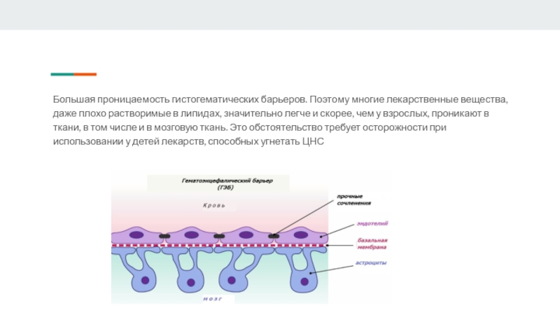 Слайд 8Большая проницаемость гистогематических барьеров. Поэтому многие лекарственные вещества, даже плохо