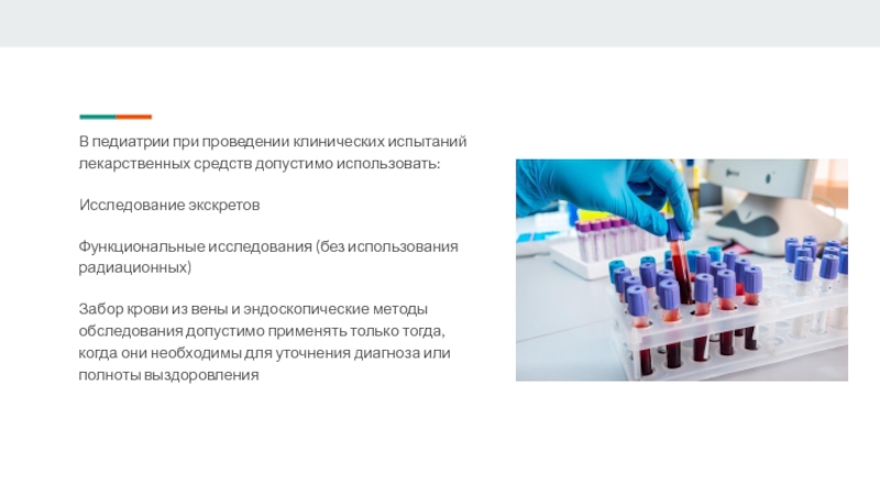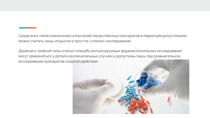Слайд 18Среди всех типов клинических испытаний лекарственных препаратов в педиатрии допустимыми