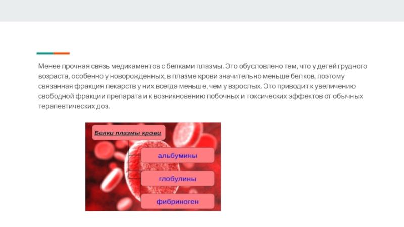 крови значительно меньше белков, поэтому связанная фракция лекарств у них всегда меньше, чем у взрослых. Это приводит к увеличению свободной фракции препарата и к возникновению побочных и токсических эффектов от обычных терапевтических доз.