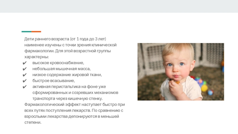 Слайд 13У детей грудного возраста имеются особенности как распределения лекарств при