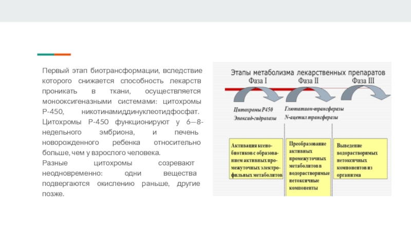 Слайд 10Первый этап биотрансформации, вследствие которого снижается способность лекарств проникать в