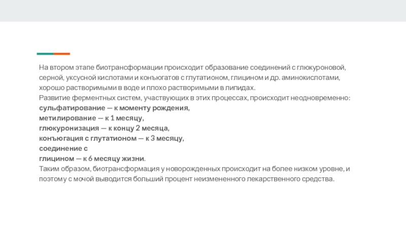 Развитие ферментных систем, участвующих в этих процессах, происходит неодновременно: сульфатирование — к моменту рождения,