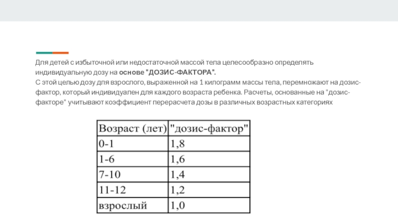 взрослого, выраженной на 1 килограмм массы тела, перемножают на дозис-фактор, который индивидуален для каждого возраста ребенка. Расчеты, основанные на "дозис-факторе" учитывают коэффициент перерасчета дозы в различных возрастных категориях