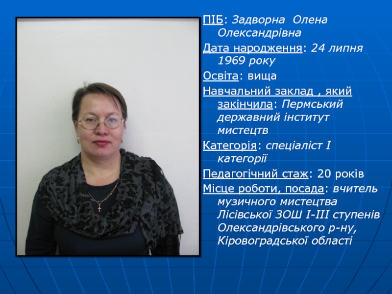Місце роботи, посада: вчитель музичного мистецтва Лісівської ЗОШ I-III ступенів Олександрівського р-ну, Кіровоградської області