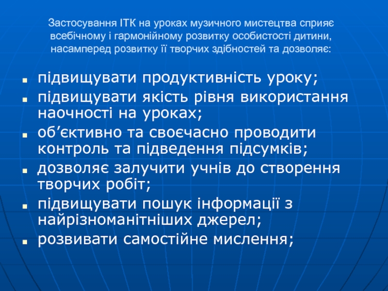 Слайд 8Застосування ІТК на уроках музичного мистецтва сприяє всебічному і гармонійному