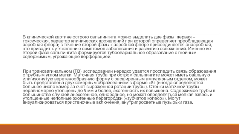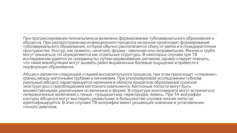 Морфологические изменения при периоофорите и оофорите проявляются нарушением микроциркуляции, отеком и инфильтрацией, что эхографически определяется как увеличение размеров, шарообразная форма и изменение (снижение) эхогенности.