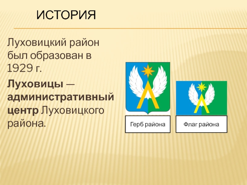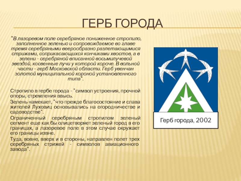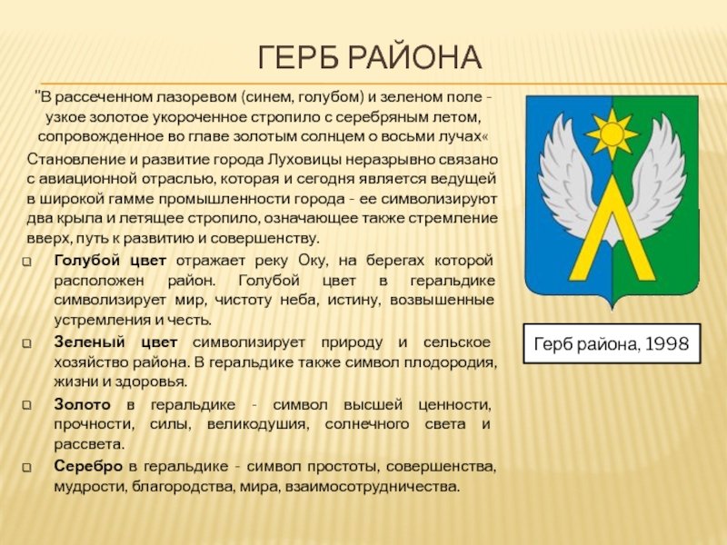 Становление и развитие города Луховицы неразрывно связано с авиационной отраслью, которая и сегодня является ведущей в широкой гамме промышленности города - ее символизируют два крыла и летящее стропило, означающее также стремление вверх, путь к развитию и совершенству.