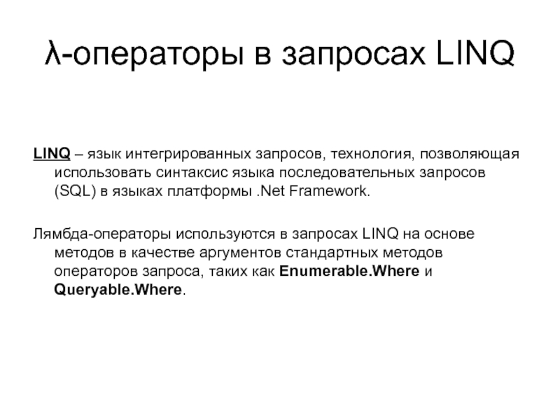 Лямбда-операторы используются в запросах LINQ на основе методов в качестве аргументов стандартных методов операторов запроса, таких как Enumerable.Where и Queryable.Where.