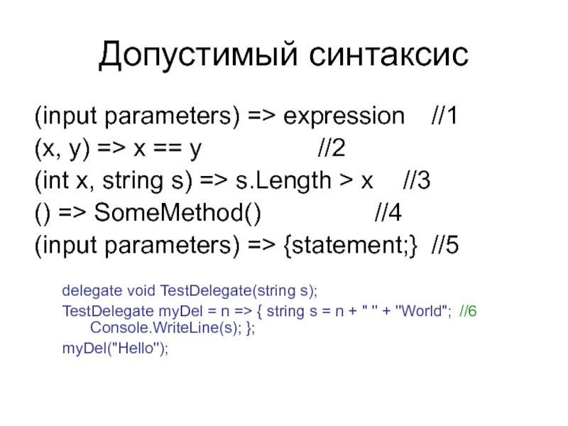 TestDelegate myDel = n => { string s = n + " " + "World"; //6 Console.WriteLine(s); };