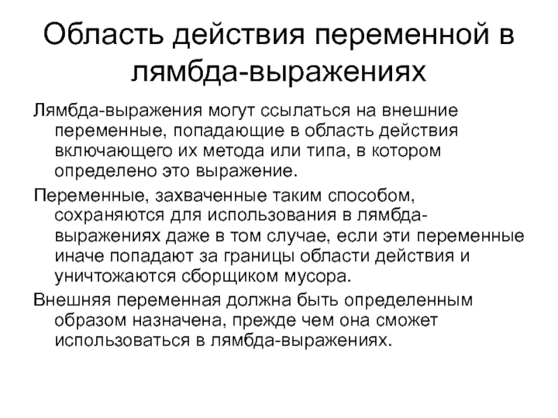Переменные, захваченные таким способом, сохраняются для использования в лямбда-выражениях даже в том случае, если эти переменные иначе попадают за границы области действия и уничтожаются сборщиком мусора.