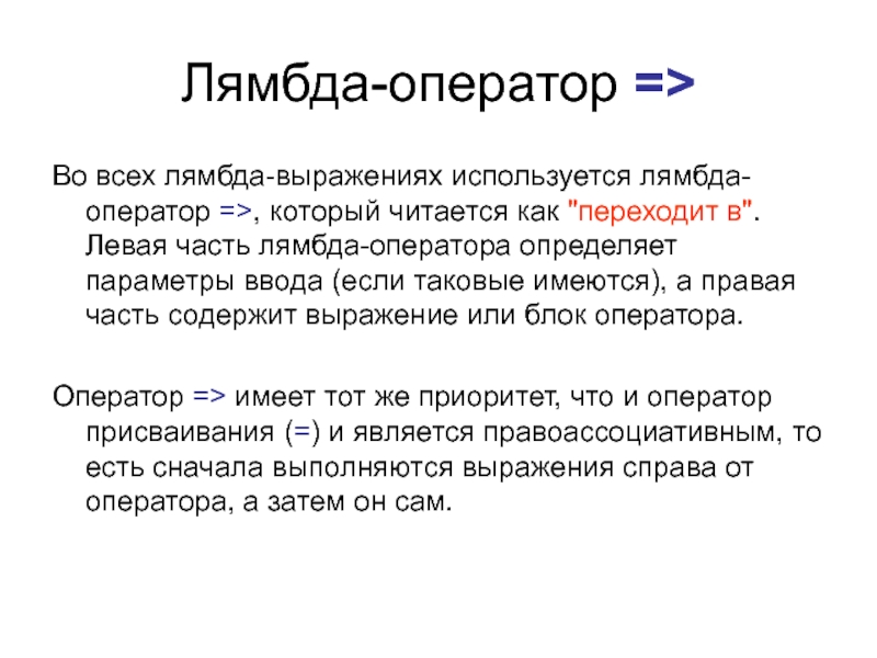 Во всех лямбда-выражениях используется лямбда-оператор =>, который читается как