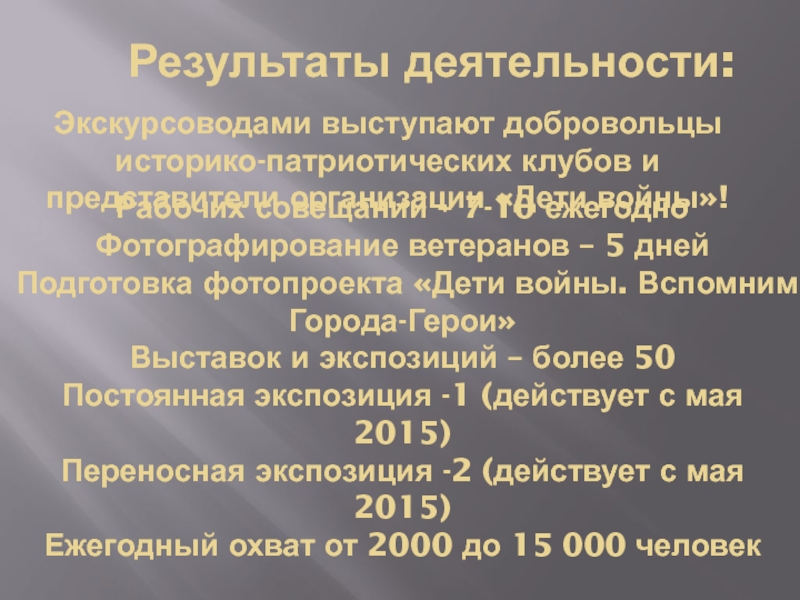 Результаты деятельности:Экскурсоводами выступают добровольцы историко-патриотических клубов и представители организации «Дети войны»!Рабочих совещаний – 7-10 ежегодноФотографирование ветеранов –