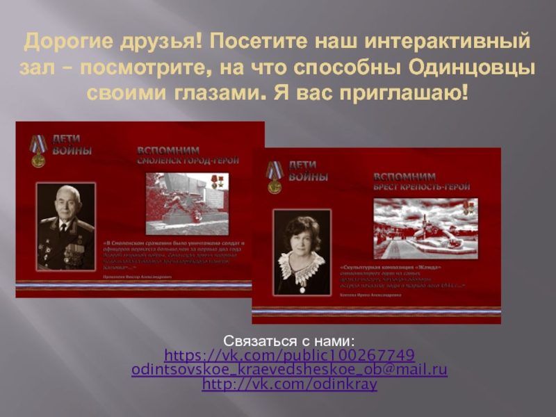 Связаться с нами:https://vk.com/public100267749odintsovskoe_kraevedsheskoe_ob@mail.ruhttp://vk.com/odinkrayДорогие друзья! Посетите наш интерактивный зал – посмотрите, на что способны Одинцовцы своими глазами. Я