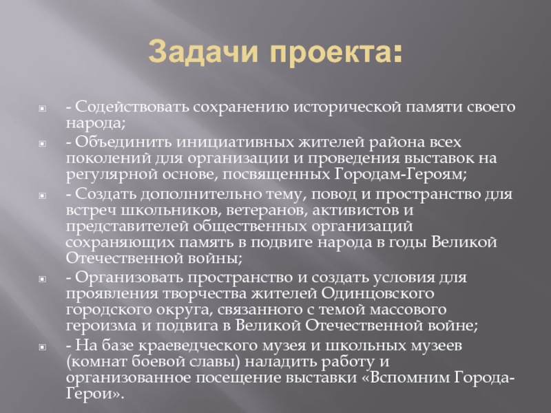 Задачи проекта:- Содействовать сохранению исторической памяти своего народа; - Объединить инициативных жителей района всех поколений для организации