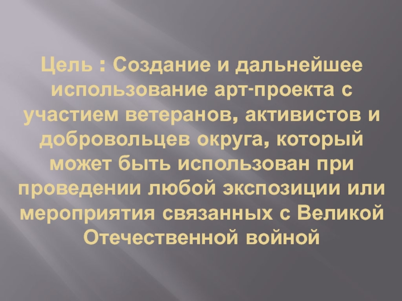Цель : Создание и дальнейшее использование арт-проекта с участием ветеранов, активистов и добровольцев округа, который может быть