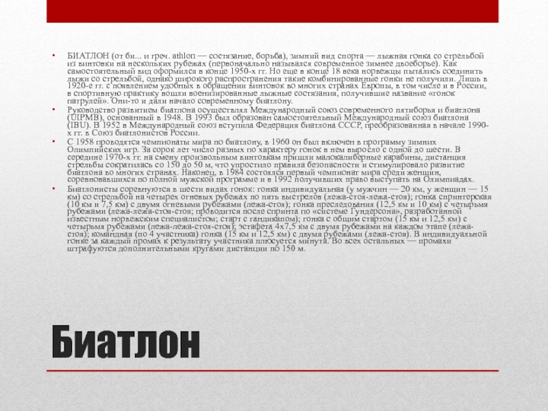 нескольких рубежах (первоначально назывался современное зимнее двоеборье). Как самостоятельный вид оформился в конце 1950-х гг. Но еще в конце 18 века норвежцы пытались соединить лыжи со стрельбой, однако широкого распространения такие комбинированные гонки не получили. Лишь в 1920-е гг. с появлением удобных в обращении винтовок во многих странах Европы, в том числе и в России, в спортивную практику вошли военизированные лыжные состязания, получившие название «гонок патрулей». Они-то и дали начало современному биатлону.