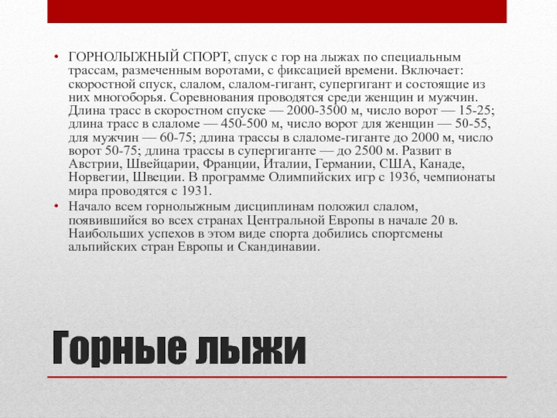 Начало всем горнолыжным дисциплинам положил слалом, появившийся во всех странах Центральной Европы в начале 20 в. Наибольших успехов в этом виде спорта добились спортсмены альпийских стран Европы и Скандинавии.