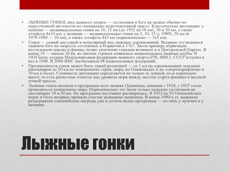 Гонки — самый массовый и популярный вид лыжных соревнований. Впервые состязания в лыжном беге на скорость состоялись в Норвегии в 1767. Затем примеру норвежцев последовали шведы и финны, позже увлечение гонками возникло и в Центральной Европе. В конце 19 — начале 20 вв. во многих странах появились национальные лыжные клубы. В 1924 была создана Международная федерация лыжного спорта (FIS, ФИС). СССР вступил в нее в 1948. В 2000 ФИС насчитывала 98 национальных федераций.