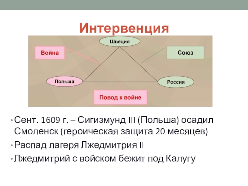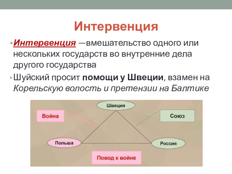 ИнтервенцияИнтервенция —вмешательство одного или нескольких государств во внутренние дела другого государстваШуйский просит помощи у Швеции, взамен на