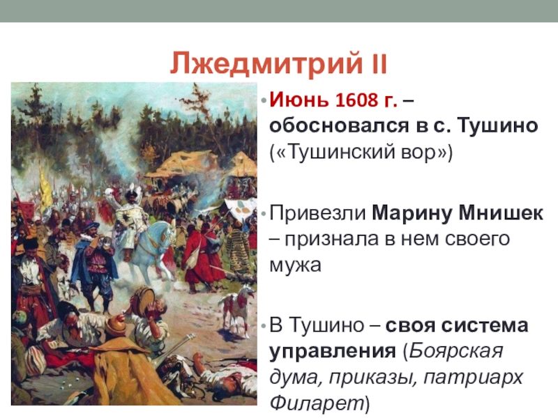Лжедмитрий IIИюнь 1608 г. – обосновался в с. Тушино («Тушинский вор»)Привезли Марину Мнишек – признала в нем