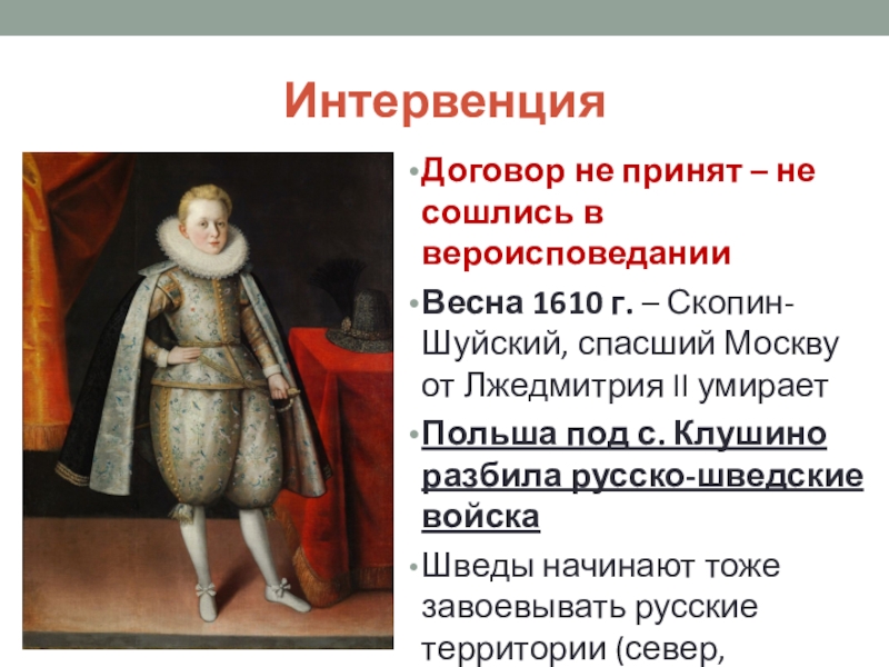 ИнтервенцияДоговор не принят – не сошлись в вероисповеданииВесна 1610 г. – Скопин-Шуйский, спасший Москву от Лжедмитрия II
