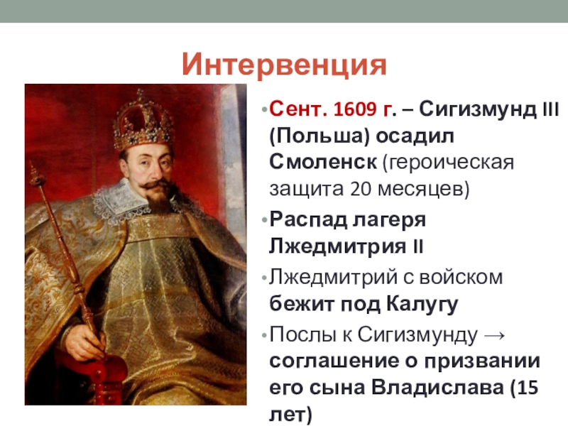 ИнтервенцияСент. 1609 г. – Сигизмунд III (Польша) осадил Смоленск (героическая защита 20 месяцев)Распад лагеря Лжедмитрия IIЛжедмитрий с
