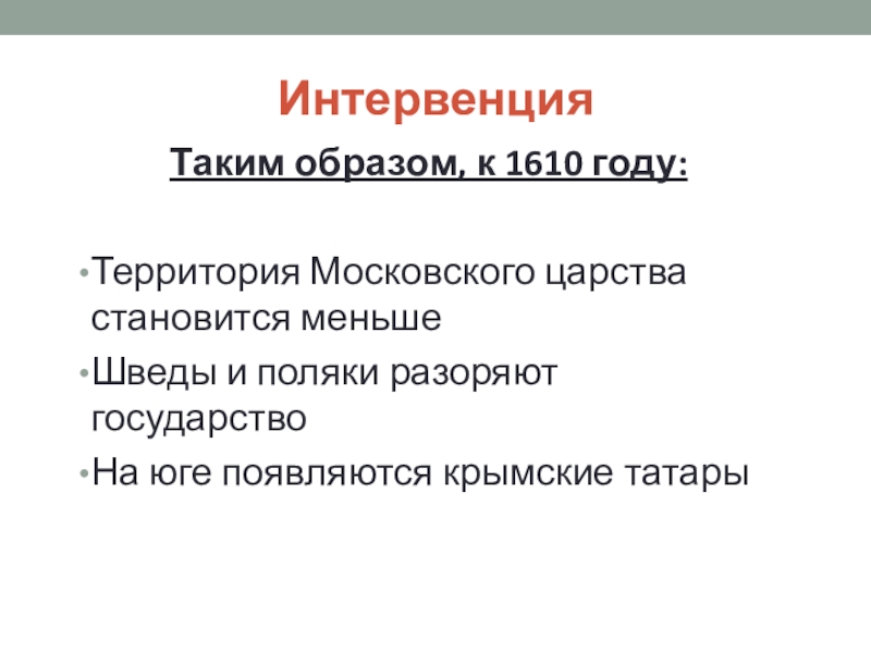ИнтервенцияТаким образом, к 1610 году:Территория Московского царства становится меньшеШведы и поляки разоряют государствоНа юге появляются крымские татары