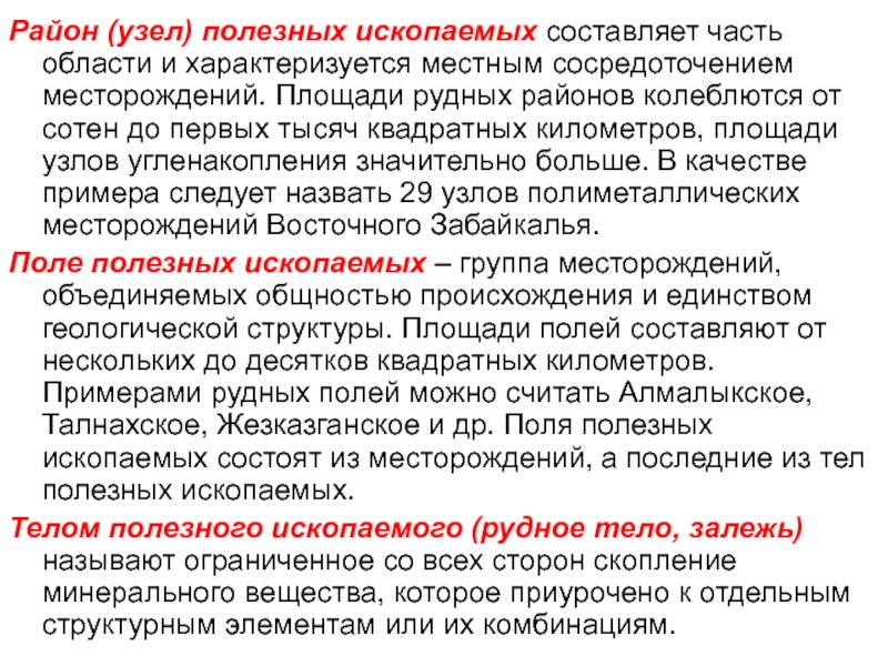 Слайд 19Район (узел) полезных ископаемых составляет часть области и характеризуется местным