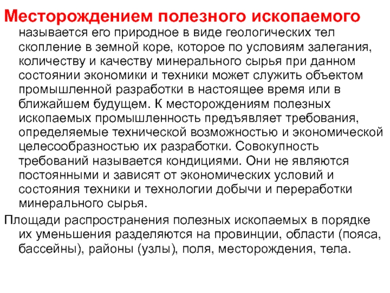 Понятия «полезное ископаемое» и «руда» являются, в известной степени условными, отражают характерные для определенного исторического периода потребности народного хозяйства в различных видах минерального сырья, технологические возможности и экономические условия их добычи, переработки и промышленного использования.