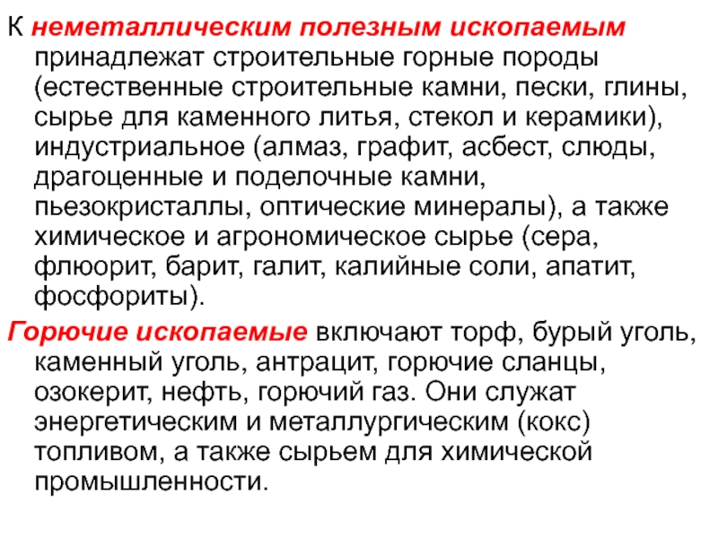 Горючие ископаемые включают торф, бурый уголь, каменный уголь, антрацит, горючие сланцы, озокерит, нефть, горючий газ. Они служат энергетическим и металлургическим (кокс) топливом, а также сырьем для химической промышленности.
