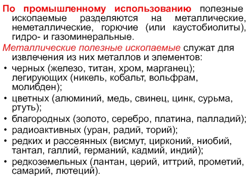 Слайд 10По промышленному использованию полезные ископаемые разделяются на металлические, неметаллические, горючие