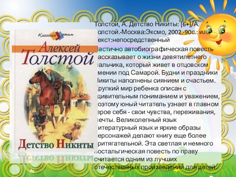 Слайд 19Толстой, А. Детство Никиты: [6+]/А.Толстой.-Москва:Эксмо, 2002.-90с.: ил.- Текст:непосредственный