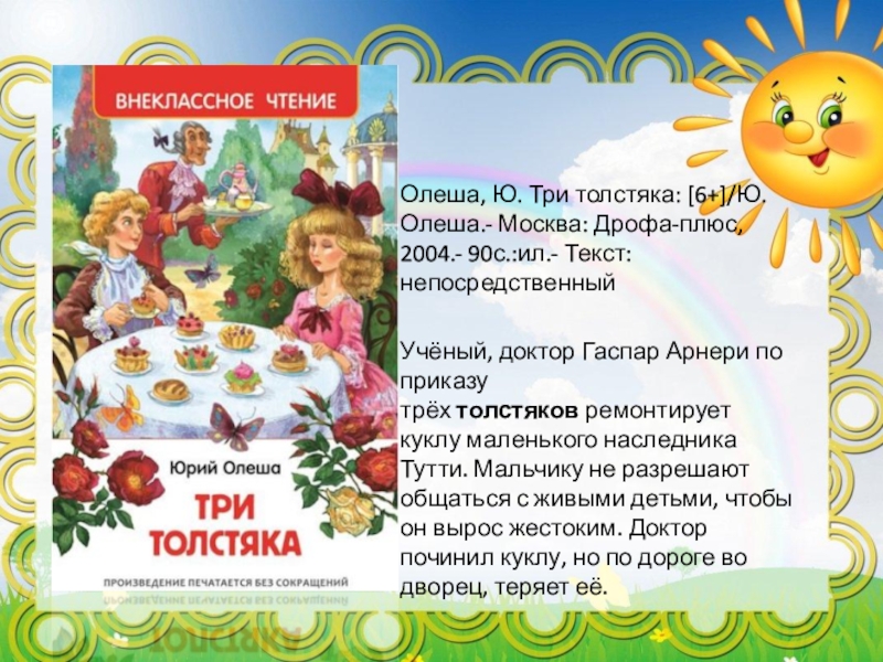 Слайд 15Олеша, Ю. Три толстяка: [6+]/Ю. Олеша.- Москва: Дрофа-плюс, 2004.- 90с.:ил.-