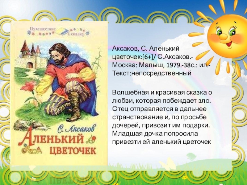 Слайд 16Аксаков, С. Аленький цветочек:[6+]/ С.Аксаков.- Москва: Малыш, 1979.-38с.: ил.-Текст:непосредственный