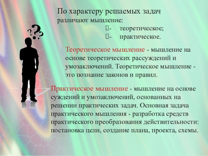 Теоретическое мышление - мышление на основе теоретических рассуждений и умозаключений. Теоретическое мышление - это познание законов и правил.