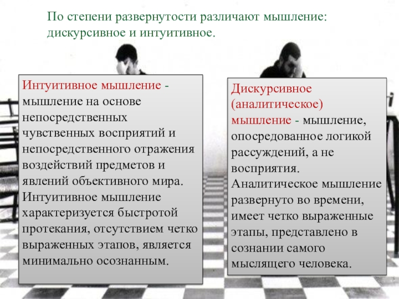 Интуитивное мышление - мышление на основе непосредственных чувственных восприятий и непосредственного отражения воздействий предметов и явлений объективного мира. Интуитивное мышление характеризуется быстротой протекания, отсутствием четко выраженных этапов, является минимально осознанным.
