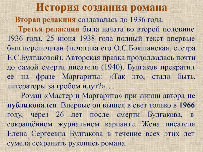 Роман «Мастер и Маргарита» при жизни автора не публиковался. Впервые он вышел в свет только в 1966 году, через 26 лет после смерти Булгакова, в сокращённом журнальном варианте. Жена писателя Елена Сергеевна Булгакова в течение всех этих лет сумела сохранить рукопись романа.
