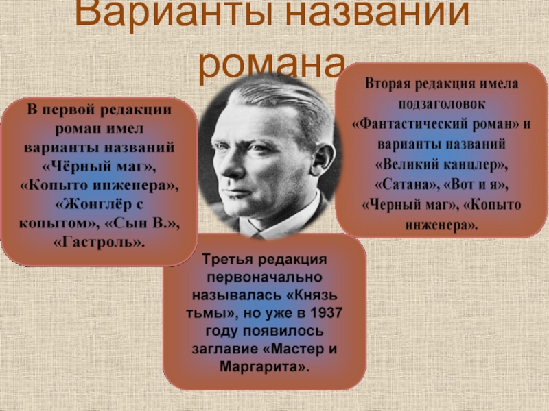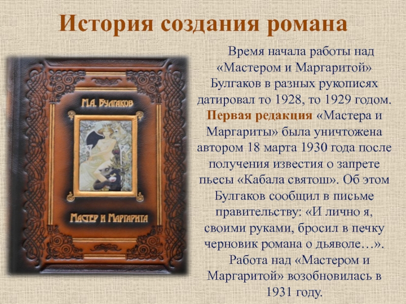 рукописях датировал то 1928, то 1929 годом. Первая редакция «Мастера и Маргариты» была уничтожена автором 18 марта 1930 года после получения известия о запрете пьесы «Кабала святош». Об этом Булгаков сообщил в письме правительству: «И лично я, своими руками, бросил в печку черновик романа о дьяволе…».