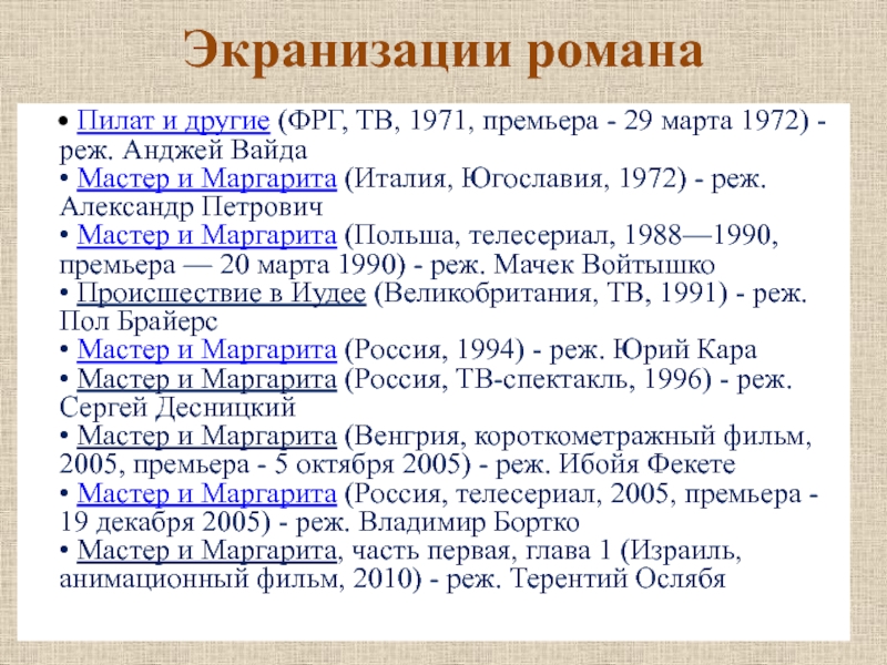 • Мастер и Маргарита (Россия, телесериал, 2005, премьера - 19 декабря 2005) - реж. Владимир Бортко